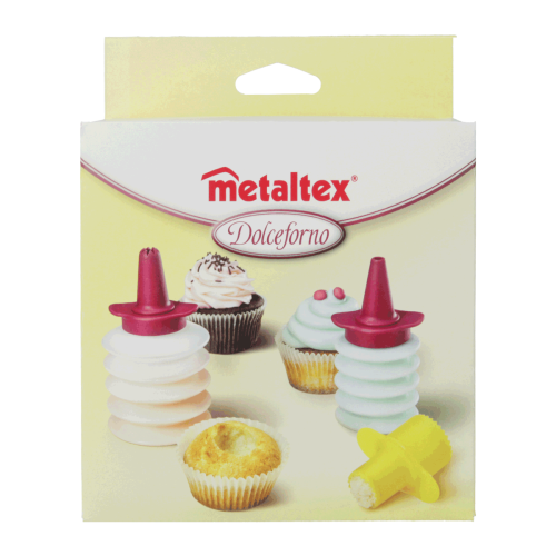 - Include 2 bottiglie a soffietto, 3 ugelli e 1 svuota cupcakes